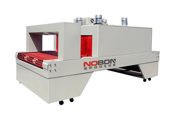 一段開放式:這個典型的實例就是托盤的收縮包裝,先將薄膜制成方底大袋,再將大袋自上而下套在堆疊商品托盤上,然后進行熱收縮。將裝好產品的托盤放在輸送帶上,套上收縮薄膜袋;由輸送帶送入熱收縮通道,通過熱收縮通道后即完成收縮包裝。其技術的主要特點就是產品可以以一定數量為單位牢固地捆包起來,在運輸過程中不會松散,并可以露天堆放。