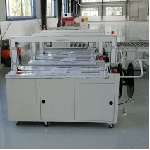 自動打包機外形設計簡單美觀;電機+減速器+凸輪+緊縮臂運作;打包緊力可調,打包機運行穩定故障少,維修方便;